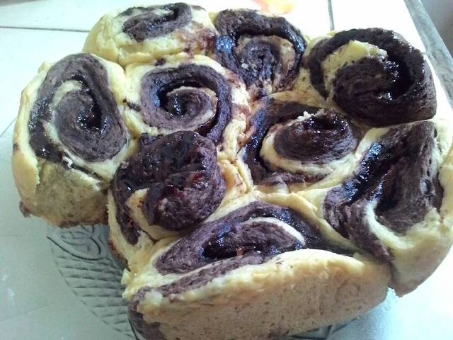 3. Setelah mengembang kempiskan adonan uleni lagi, lalu bagi adonan menjadi 2, adonan yg 1 nya tambahkan coklat bubuk, uleni hingga tetcampur rata,