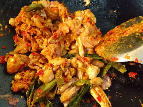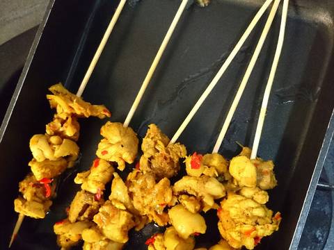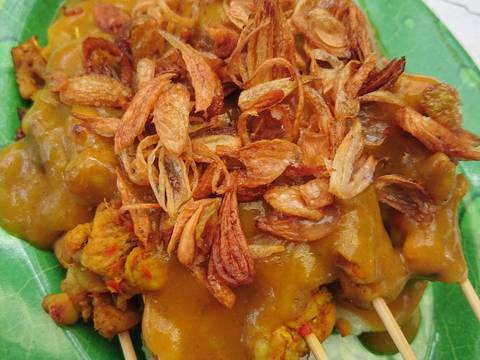 2. Bumbu halus di tumis sampai wangi, lalu masukkan daun rempah, daging ayam tumis sebentar lalu tambah kan air kira kira 1 liter masukkan garam dan gula, cek rasa, masak hingga daging matang, angkat daging nya lalu di tusuk dengan tusuk sate, kuah daging nya tadi di saring, masukkan tepung beras sambil di aduk cepat, matikan apinya bila sudah mendidih