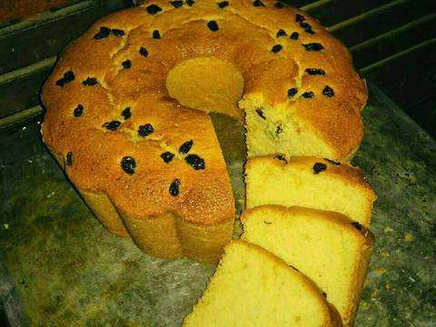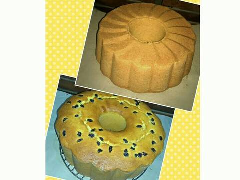 5. Tuang adonan ke loyang, ratakan tabur kismis. Panggang dg api sedang selama 45-50 menit (saya pake otang).
