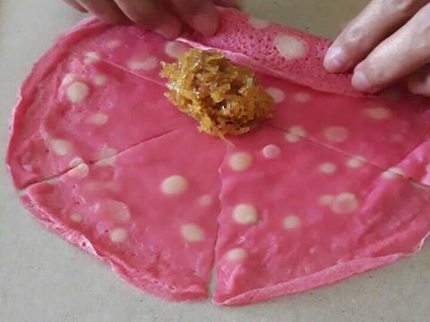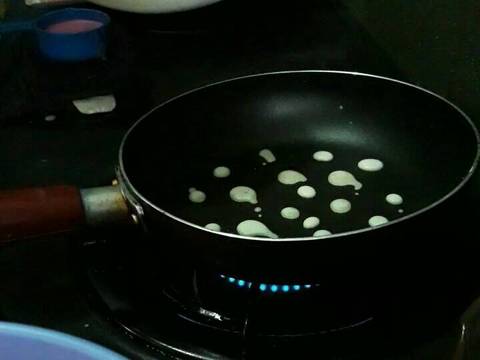 Panaskan teflon,teteskan adonan putih,kemudian ambil 1 sendok sayur warna ungu tuang ke teflon dan goyangkan teflon hingga bentuk bulat. Lakukan sampai adonan habis
