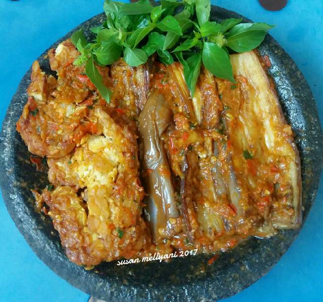 3. Taruh terong dan tempe di atas sambal lalu penyet pake ulekan,selesai 😊