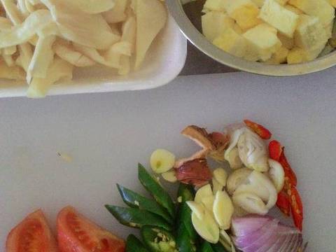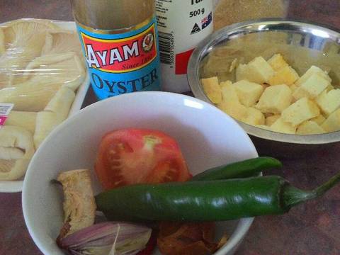 2. Cuci bersih jamur tiram lalu suwir2, potong2 putih telur. Iris2 juga bawang putih bawang merah dan cabenya.