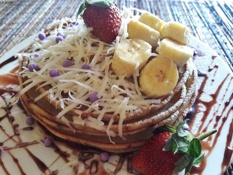 5. Sajikan dengan toping menarik seperti susu kental manis coklat, ayak gula halus, irisan pisang, purple candy, parutan keju dan strawbery. Woow 😍