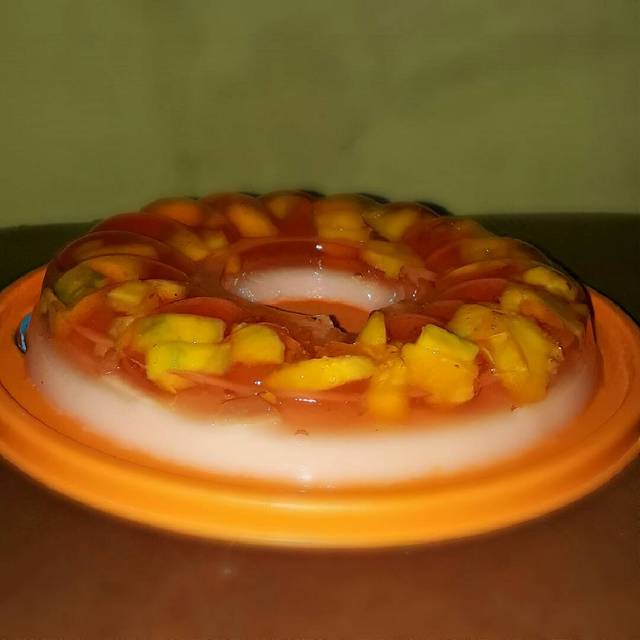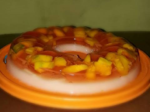 3. Potong2 mangga dan susun dlm cetakan,kemudian masukan larutan nutrijel yg pertama,tunggu hingga mengeras